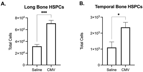 Temporal bone hematopoietic stem and progenitor cells (HSPCs) are sensitive to perinatal infection with CMV. Flow cytometric analysis of HSPCs (Lin− c-kit+ Sca-1+) of post-natal day 10 mice that were treated with saline or mCMV at post-natal day 3. (A). Long bone (femur and tibia) marrow HSPCs significantly expand in response CMV infection (7dpi). (B). Temporal bone contains fewer HSPCs than tibial bone marrow, but similarly expand in response to CMV infection. Error bars represent the mean ± SEM. N = 7–13 mice per treatment across 2–4 litters. * p < 0.05, *** p < 0.001.