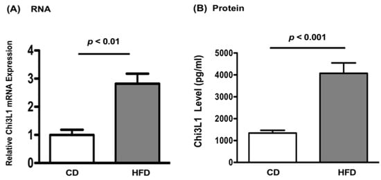 Real time PCR was used to evaluate Chi3L1 gene expression in the murine liver. When compared with CD fed mice, it was observed that HFD significantly increases Chi3L1 gene expression p < 0.01 (Figure 3A). The Chi3L1 protein levels were also measured by ELISA in cell lysates of the same liver samples. In comparison to CD fed mice, HFD significantly increased Chi3L1 protein levels in the liver as well (Figure 3B, 4073 ± 476.9 pg/mL vs. 1344 ± 123.9 pg/mL, p < 0.001).