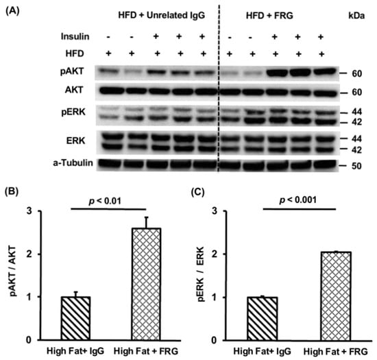 The FRG is one of three anti-Chi3L1 mAbs that were administered to mice for 16 weeks. Control mice received unrelated IgG at the same dose and frequency. We evaluated the effects of FRG administration on hepatic insulin signaling as well as lipid accumulation in the liver. The HFD induced insulin resistance following stimulation (Figure 4A). It was observed that FRG administered twice a week significantly increased pAKT/AKT (Figure 4B, p < 0.01 vs. unrelated IgG treated control) and pERK/ERK expression (Figure 4C, p < 0.001).
