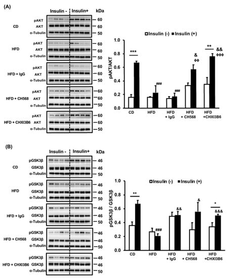 Effect of anti-Chi3L1 mAbs on hepatic insulin signaling. (A) The expression of pAKT and AKT in the murine liver. The lower right panel showed the quantification by densitometry of Western blot results. ** p < 0.01, *** p < 0.001 vs. insulin (−) in the same group; ### p < 0.001 vs. CD insulin (+); & p < 0.05, && p < 0.01 vs. HFD insulin (+) ᶲᶲ p < 0.01, ᶲᶲᶲ p < 0.001 vs. HFD + IgG insulin (+), N = 4. (B) The expression of pGSK-3β and GSK in the murine liver. In the upper panel, the Western blot results for pGSK-3β and GSK protein expression are shown. The lower panel shows the quantification of Western blot data. * p < 0.05, ** p < 0.01 vs. insulin (−) in the same group; ### p < 0.001 vs. CD insulin (+); & p < 0.05, && p < 0.01, &&& p < 0.001 vs. HFD insulin (+), N = 4.