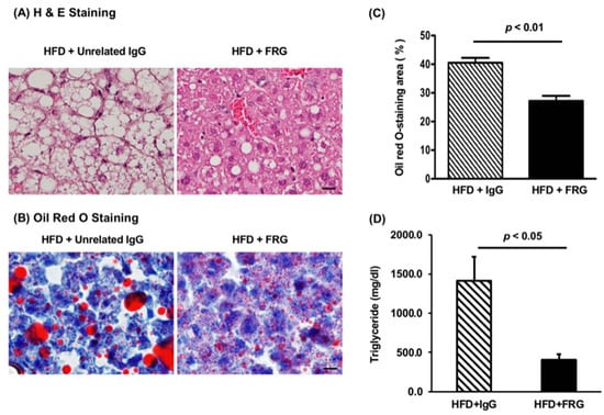 In order to determine if the anti-Chi3L1 mAb administration could also affect lipid accumulation, we examined H & E stained slides (Figure 6A) and evaluated neutral fat accumulation by ORO staining (Figure 6B,C) as well as measured triglyceride levels (Figure 6D). The results revealed that FRG treatment substantially reduced the size of the fat droplets in the cytoplasm of hepatocytes (Figure 6A). The ORO staining (Figure 6B) and quantification analysis demonstrated that FRG administration significantly reduced neutral lipid accumulation (Figure 6C, p < 0.01). Triglyceride levels in FRG treated mice were also significantly lower than that in the unrelated IgG treated control group (Figure 6D, p < 0.05).