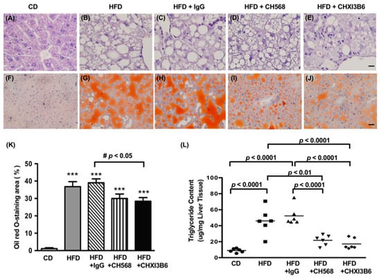 Representative ORO staining images are shown in Figure 7F–J and revealed that HFD produced increased neutral fat accumulation in the cytoplasm of hepatocytes (Figure 7G–J). The size of lipid droplets decreased in anti-Chi3L1 mAb treated mice as represented in groups 4 and 5 (Figure 7I,J) in Table 1. In comparison with the CD, HFD significantly increased neutral lipid accumulation in the murine liver (p < 0.0001 vs. CD, Figure 7K) which was reduced by anti-Chi3L1 mAb treatment.