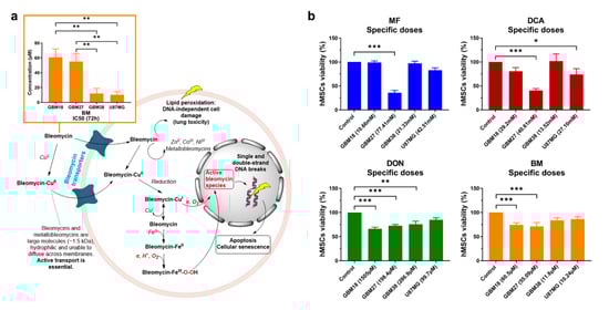 (a) IC50 values at 72 h and mechanism of action of radiomimetic drug bleomycin (BM). Bleomycin is a large molecule (~1.5 kDa) and cannot freely diffuse cell membranes; it is transported into cells either alone or as a bleomycin-Cu(II) complex, then reduced to bleomycin-Cu(I), which reacts with oxygen leading to DNA strand breaks. Successful chemotherapy with bleomycin is dependent on active transport; however, there is currently no consensus about the uptake mechanism or the transporters involved. Bleomycin-Cu(I) can also dissociate inside the cell to form bleomycin-Fe(II) complexes, transforming into «activated bleomycin species» resulting in DNA fragmentation and chromosomal aberrations. Complexes with zinc (II), iron (II) and cobalt (III) have also been characterized. Calculated IC50, as per inner salt (MTS) assay, with a minimum of two biological replicates. One-way ANOVA with Tukey correction, p < 0.05 *; p < 0.01 **; p < 0.001 ***. (b) Viability profiles relative to control mesenchymal stem cells (hMSCs) treated with all calculated 72h-IC50 doses (n = 2). One-way ANOVA with Dunn’s correction, p < 0.05 *; p < 0.01 **; p < 0.001 ***.