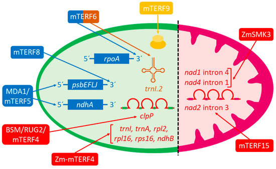 Schematic representation of the molecular functions of plant mTERFs. Colors of mTERF proteins and arrows refer to their activity as regulators of (i) transcription (blue), functioning as transcriptional pausing and stabilization (MDA1/mTERF5) or terminator (mTERF6 and mTERF8) factors of chloroplast genes (psbEFLJ polycistron, ndhA gene, and rpoA operon), (ii) group II intron splicing (red) of chloroplast (BSM/RUG2/mTERF4 and Zm-mTERF4) or mitochondria (mTERF15 and ZmSMK3) clpP, trnI, trnA, rpl2, rpl16, rps16, nad1, ndhB, nad1, nad2 and nad4 genes or (iii) translation (orange) of chloroplasts (mTERF9) promoting ribosomal assembly. mTERF6 also functions in trnI.2 maturation (brown). Green and purple semi-ovals represent, respectively, chloroplasts and mitochondria.
