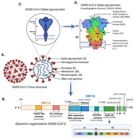 SARS-CoV-2 belongs to the Betacoronavirus genus and is a member of the Coronavirinae family []. The virus particles are spherical or pleomorphic in shape, with a diameter of about 60–140 nm. Coronaviruses have one of the largest single-strand RNA genomes with 27–32 kilobases (kb) (Figure 1) []. Some of the coronaviruses encode for the hemagglutinin-esterase protein, 3a/b protein, and 4a/b protein on their surface [,,,,]. The genome organization of SARS-CoV-2 is similar to other coronaviruses, which is composed of mainly the open reading frames (ORFs). Roughly 67% of the genome encodes by the ORF1a/b and it encodes for 16 nonstructural polyproteins (nsp1-16), while the remaining 33% encodes for accessory proteins and structural proteins. ORF1a and ORF1b contain a frameshift which produces two polypeptides, pp1a and pp1ab. Papain-like protease (PLpro) or chymotrypsin-like protease (3CLpro), process these two polypeptides into 16 nsps (Figure 1B) []. SARS-CoV-2 encodes for at least four major structural proteins that includes spike protein (S), membrane protein (M), an envelope protein (E), and nucleocapsid protein (N). These structural proteins are encoded by S, M, E, N genes at ORFs 10 and 11 on the one-third of the genome near the 3′-end (Figure 1A,B) []. These mature structural proteins are responsible for viral maintenance and replication []. Most of the probes and primers used to detect the SARS-CoV-2 are constructed against the genetic targets of ORF1ab and the N gene region [].