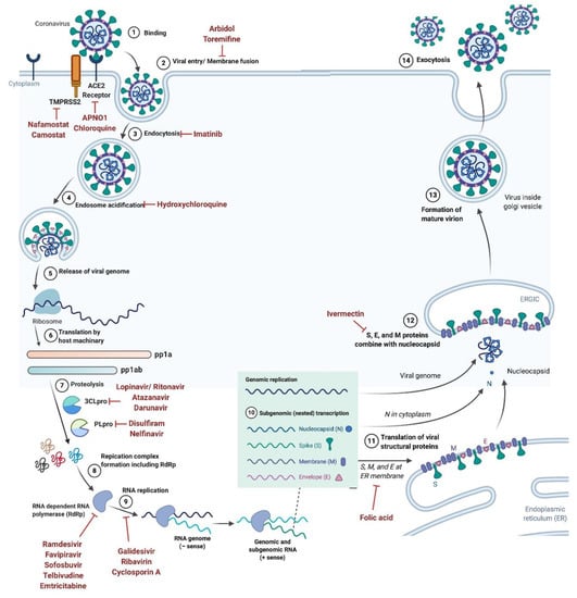 As of today, there is no clinically proven and specific antiviral drug available for treating the SARS-CoV-2 infection []. Most treatment trials are based on molecular mechanisms and genomic organization of SARS-CoV-2. There are several existing antiviral agents that could potentially be repurposed or developed into effective interventions for this novel coronavirus. Some of these approaches are detailed below.