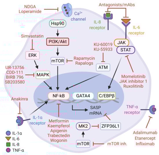 As alluded to earlier, the secretory component of senescent cells is mainly orchestrated by NF-κB and C/EBPβ. These transcription factors are modulated by upstream signaling networks which clearly represent attractive therapeutic targets for senostatic interventions. Senostatics are characterized as the drugs that repress markers or phenotypes of senescent cells without promoting apoptotic cell death. To date, several natural or pharmacological agents have been proposed to effectively blunt these pathways and mitigate the deleterious consequences of pro-tumorigenic SASP factors (Figure 2).