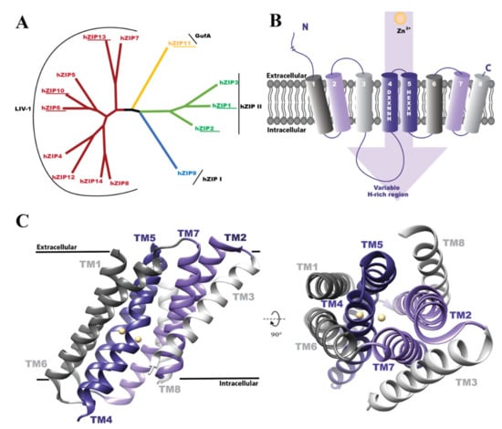 In humans, the ZIP family encompasses 14 members that, based on sequence similarity, are divided into four subfamilies, i.e., hZIP I, hZIP II, GufA, and LIV-1 (Figure 1A) [,]. Human ZIPs (hZIPs) have been proposed to regulate zinc homeostasis in a tissue- and cell type-specific manner, as reflected by their subcellular localization [,,,]. As examples, hZIP1 mediates microglial activation by autocrine and paracrine signaling []; hZIP2 is specifically expressed in the epidermis, responsible for differentiation of keratinocytes and skin turnover []; hZIP4 is located to the apical membrane of enterocytes and regulates dietary zinc absorption []; whereas hZIP10 plays an important role in maintenance of the immune system, as it is key for early β-cell survival []. In addition, altered protein expression or malfunction of hZIPs has been linked to a plethora of conditions, including several cancers, dermatitis, and neurodegenerative autoimmune diseases []. For instance, reduced levels of hZIP1, 2, and 3 were reported in the two types of prostate cancers [,], and upregulation of hZIP4 and 6 was shown to stimulate proliferation of pancreas and breast tumors, respectively [,]. Moreover, hZIP11 single nucleotide polymorphisms correlate with the development of bladder cancer, having either protective or increased risk of cancer progression []. Furthermore, loss-of-function mutations in hZIP4 lead to acrodermatitis enteropathica, a rare genetic disorder leading to Zn2+ deficiency manifested by skin lesions, growth retardation, immune system dysfunction, and neurological complications []. In addition, hZIP13 has been demonstrated to play a key role in development of the connective tissue and its malfunction can result in spondylocheiro dysplastic form of Ehlers-Danlos syndrome, a rare disorder of the connective tissue [,]. Consequently, hZIPs represent attractive targets to discover novel compounds for therapeutic purposes.