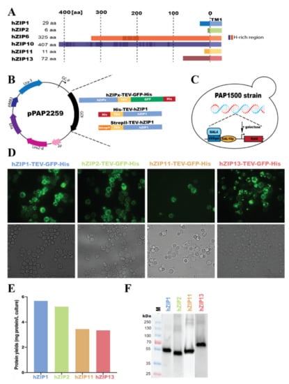 The applied S. cerevisiae system exploits modified high-copy vectors encoding codon-optimized full-length hZIPs C-terminally fused to tobacco etch virus (TEV) protease-detachable GFP-His-tag, enabling localization, quantification, quality control, and affinity purification (Figure 2B).