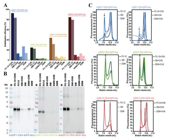 Prior to most biochemical and biophysical studies, MPs need to be extracted in their native form from the surrounding membranes. Thus, successful purification relies on the capacity of surfactant(s) to efficiently solubilize the membranes and maintain isolated protein stable in solution []. To systematically assess and identify detergents that can effectively extract each of the remaining hZIPs, we performed initial screening using a panel of surfactants tested in the presence or absence of cholesteryl hemisuccinate Tris salt (CHS) at a fixed pH value and ionic content (data not shown). In general, the four tested hZIP-TEV-GFP-His fusions appeared difficult to extract in milder surfactants. High solubilization efficacies were achieved only in harsh anionic or zwitterionic detergents (e.g., N-lauroylsarcosine sodium salt or foscholines, respectively), compounds typically not applicable for the downstream investigation of MPs. Three of the examined detergents, i.e., FC-12, a harsh zwitterionic compound, and two milder nonionic surfactants, i.e., DM and DDM, representing the two most commonly used detergents in MP studies [], displayed favorable extraction efficiencies (Figure 3A). However, both DM and DDM performed only moderately when extracting hZIP2-, hZIP11-, and hZIP13-TEV-GFP-His, yielding solubilization efficacies >10%. Interestingly, for these three detergents, we observed an increase in solubilization efficacy upon supplementation with CHS. However, target-specific variations were observed, with hZIP1-TEV-GFP-His being the most prone and hZIP2-TEV-GFP-His the most refractory to membrane solubilization, respectively. Combining both estimated production levels and extraction efficacies, we decided to proceed with the three most promising candidates, i.e., hZIP1, 2, and 13. In contrast, hZIP11 was excluded due to its low expression levels and inefficient solubilization. Importantly, for the three selected targets, SDS-PAGE analysis of membranes solubilized in all three applied detergents exhibited the expected migration pattern and stability of TEV-GFP-His fusions (Figure 3B), without any visible signs of protein degradation.