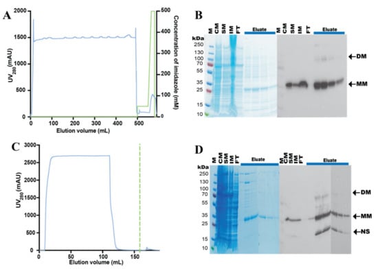 - Mohanty, A.K.; Wiener, M.C. Membrane protein expression and production: Effects of polyhistidine tag length and position. Protein Expr. Purif. 2004, 33, 311–325. [Google Scholar] [CrossRef] [PubMed]