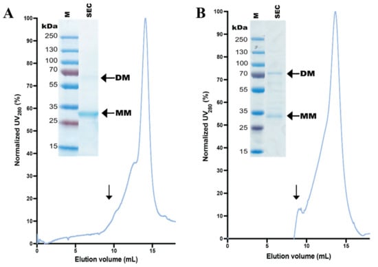 Affinity-based protein purification yielded milligram amounts of both N-terminal hZIP1 fusions, although the relative purity of the samples marginally differed (Figure 5). However, while a single chromatography round was sufficient to produce a highly pure sample of StrepII-TEV-hZIP1, two additional steps were included for His-TEV-hZIP1, i.e., TEV protease cleavage and R-IMAC (Figure S3). Although both samples exhibited high monodispersity, as assessed by SEC (Figure 6), the purified variants displayed limited stability, tending to precipitate after freeze–thawing cycles. Moreover, freshly prepared, nonfrozen samples precipitated also at concentrations exceeding 9 mg mL−1. However, such concentrations are compatible with requirements for most of the biophysical experiments, including X-ray crystallography [] and cryo-EM, where even low amounts of the sample can be utilized [].