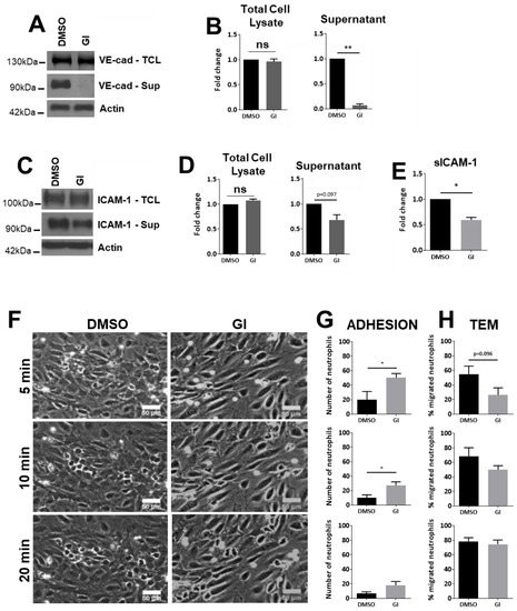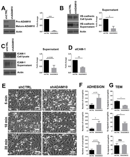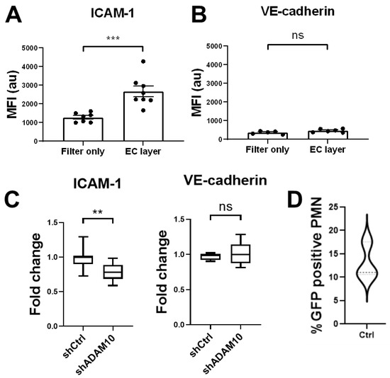 A disintegrin and metalloproteinases (ADAMs) are proteases that are involved in the shedding of a large number of cell surface proteins [11]. We and others have previously shown that ADAM10 and 17 can cleave the junctional adhesion molecule vascular endothelial (VE)-cadherin [12,13], which maintains endothelial barrier function and plays a crucial role during paracellular TEM of neutrophils [14]. In vivo findings in mice with a genetic deficiency of ADAM10 in leukocytes showed impaired TEM of leukocytes [15], in line with an in vitro study using small interfering RNA against ADAM10 in T-cells, as well as in endothelial cells by mediating the cleavage of VE-cadherin [13]. ICAM-1 and VCAM-1 are prone to be cleaved from the surface, e.g., by ADAM17 [16,17,18]. However, the functional consequence of ADAM-mediated cleavage of ICAM-1 from the endothelium for leukocyte TEM remains ambiguous.