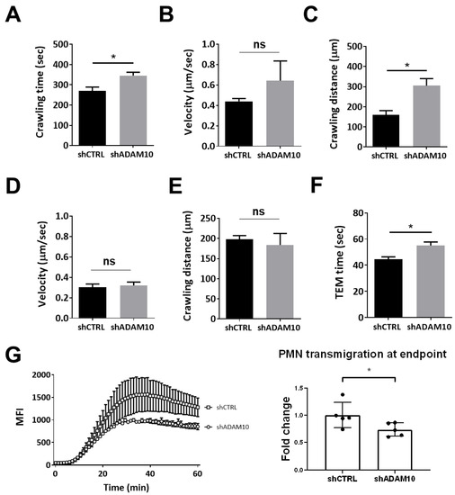 Adherent and crawling neutrophils on apical surface of TNFα-treated endothelium. (A) Crawling time (in seconds) of neutrophils from adhesion to diapedesis was determined for neutrophils that crossed either shCTRL or shADAM10-treated EC monolayers. (B) Velocity (µm/s) and (C) distance (µm) are determined on neutrophils that were on top (apical) of the endothelium that was silenced for ADAM10 (shADAM10) or treated with shCTRL. (D) Velocity (µm/s) and (E) distance (µm) are determined on neutrophils that were underneath (basolateral) of the endothelium that was silenced for ADAM10 (shADAM10) or treated with shCTRL. (F) Time (in seconds) of actual diapedesis measured for neutrophils that crossed either shCTRL or shADMA10-treated endothelial cell monolayers. Data are mean of at least three independent experiments. * p < 0.05. (G) Transwell system is used to allow calcein-labeled neutrophils to cross an endothelial monolayer that was cultured on a FN-coated filter with 3 µm pore size including fluorescent block. Increase in fluorescence was detected in real-time using a fluorimeter and showed increased neutrophil migration towards C5a. Squares represent shCTRL-ECs and open circles represent shADAM10-ECs. Graph on the right shows quantification after 20 min. Data are mean of at least three independent experiments. * p < 0.05.