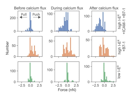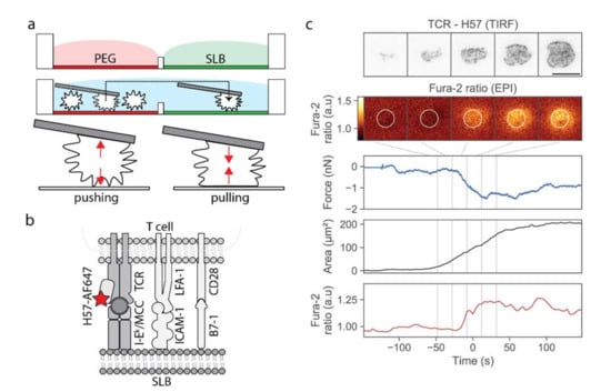 - It allows for parallel readout not only of commonly recorded signals such as the TCR distribution or intracellular calcium levels, but also of pushing and pulling forces exerted by the T-cells on the SLB. A number of previous reports have highlighted the relevance of force in T-cell antigen recognition [26,27,28,29,30,31,32,33]. In agreement with existing literature, we observed T-cell-imposed forces amounting to magnitudes of up to 3 nN upon the T-cell making contact with stimulating SLBs [33].