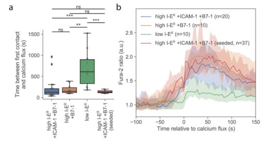 Analysis of the calcium signals. (a) Duration of the T-cell contact preceding a rise in intracellular calcium. Data are shown as Whisker box plots indicating the interquartile range (box), median (line), and the individual data points corresponding to single cells (circles). (**, p < 10−2; ***, p < 10−3) (n = 20, 10, 10, and 7 cells from left to right). (b) Median Fura-2 ratio of activating T-cells for given conditions. Shaded regions were determined via bootstrapping.