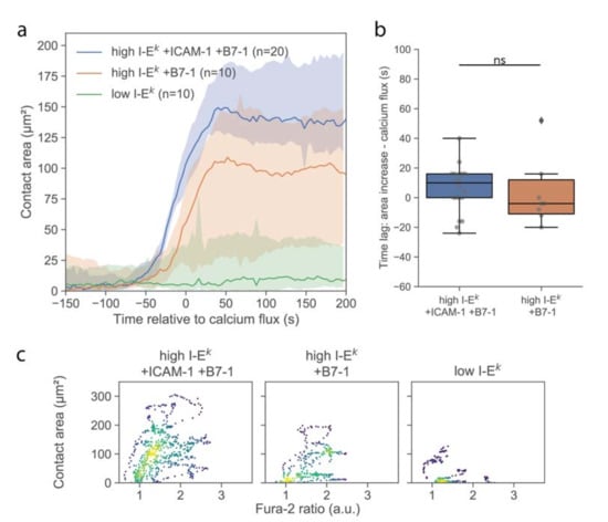 Analysis of the T-cell contact area. (a) Median contact area as function of time. Before averaging, the time axis of each data set was shifted by the half-maximal time of the calcium signal. Shaded areas represent 95% confidence intervals. (b) Lag between half maximal area increase and calcium signal. Data are shown as Whisker box plots indicating the interquartile range (box), median (line), and the individual data points corresponding to single cell (circles) for high I-Ek/MCC + ICAM-1 + B7-1 (blue, n = 20 cells) and high I-Ek/MCC + B7-1 (orange, n = 10 cells). (c) Contact area of individual T-cells was plotted against the corresponding Fura-2 signal in a parametric plot, where time is the parameter. For each cell, we included 37 data points recorded in the time interval, ranging from 50 s before to 100 s after the calcium increase. Colors indicate density of data points. Data are shown for T-cells interacting with SLBs featuring ICAM-1, B7-1 and high I-Ek/MCC (n = 20 cells), B7-1 and high I-Ek/MCC (n = 10 cells), and low I-Ek/MCC (n = 10 cells) (ns, p > 0.05).