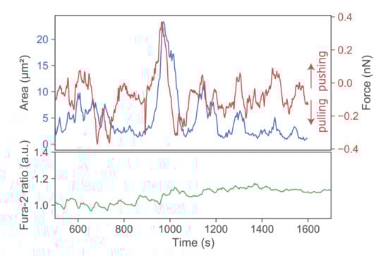 In a typical workflow, we first seeded T-cells into the storage chamber, and selected a single cell using transmission light microscopy. A tipless poly-D-lysine-coated AFM cantilever was lowered toward the selected T-cell until contact was established, and the T-cell was allowed to adhere to the AFM tip for 3 min. At the time-point of first contact, we kept the force exerted onto the selected T-cell as small as possible (<0.3 nN). We verified via calcium imaging whether the contact between the T-cell and the cantilever itself led to activation; on average, only ~7% of the cells showed increased calcium levels after pickup. These cells were excluded from further analysis. Next, we transferred the adhered T-cell via the cantilever from the storage chamber to the measurement chamber, and lowered the T-cell toward the functionalized supported lipid bilayer. Cell lifting and transfer to the measurement chamber took a few seconds. The approach to the SLB was done with incrementally smaller step sizes, lasting in total from 40 to 450 s. During and after the approach, we recorded and monitored three characteristic signals: the cantilever deflection (reporting pushing and pulling forces), the calcium signal, and the fluorescence signal originated from H57-AF647 decorated TCRs. As described in the Materials and Methods section, we used epi-fluorescence excitation to record the calcium signal, and TIRF excitation to record the TCR signal; biplane imaging allowed for focusing simultaneously on the lipid bilayer (TCR channel) and the cell center (calcium channel). As soon as a signal appeared in the TCR channel, indicating the contact of the T-cell with the supported lipid bilayer, we stopped the approach and halted the AFM cantilever at a constant height; in particular, we did not push the T-cell toward the SLB. A typical example of a single T-cell brought into contact with a strongly activating supported lipid bilayer is shown in Figure 1c and Video S1. After a phase of cellular tip-toeing [17]—the formation of transient small-scale contacts via individual microvilli characteristic for scanning T-cells [18,19]—we observed a sudden increase in the contact area, accompanied by an increase in the calcium signal. At the same time, we recorded the cantilever deflection during the adhesion and activation process.
