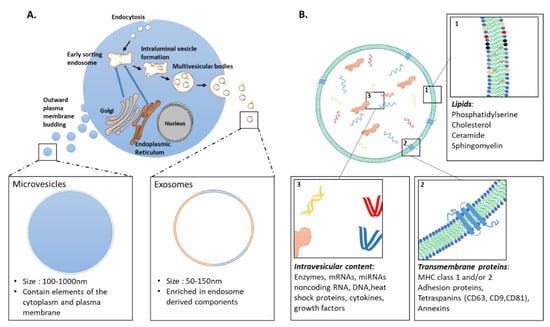 Biogenesis and general composition of EVs. (A) Scheme describing the biogenesis of EVs: Microvesicles are produced via the outward budding of the plasma membrane whereas exosomes arise from the fusion of multivesicular bodies with the plasma membrane. Early sorting endosomes receive materials from endoplasmic reticulum, golgi and the endocytic pathway. Multivesicular bodies are generated through the formation of intraluminal vesicles in the late sorting endosome. (B) Illustration of nucleic acids, proteins and lipids that can be present in EVs (this list is not exhaustive). Exact nature of EV cargo depends on the cell type, culture conditions (i.e., stress) and pathological state.