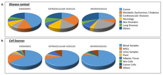 Planned or initiated clinical trials based on EVs. Diagrams representing the proportion of clinical trials targeting a group of diseases (A) or using a specific EV source (as biomarker or therapeutic); (B). These diagrams were obtained following a database search on the Clinicaltrial.gov website with indicated search terms (exosomes, extracellular vesicles, microvesicles). The majority of clinical trials use EVs as biomarkers from the blood or urine.