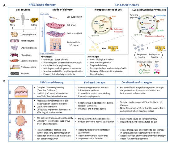 Disease-specific regenerative medicine strategy: toward tailored approaches. (A) Source material, mode of delivery and advantages of EV and hPSC-based therapies. (B) Therapeutic effects of EVs and cell therapies in preclinical animal models for selected organs (eye, skin, heart, skeletal muscle) and expected cumulative effects.