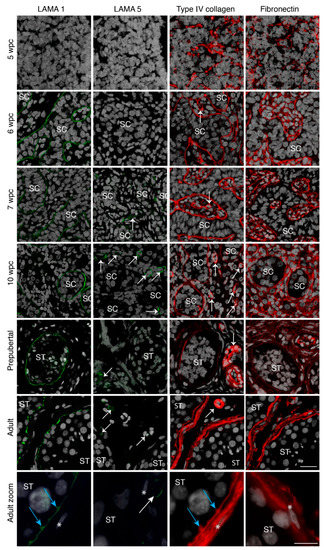 Basement membrane expression of prenatal gonadal and postnatal testicular tissue. Laminin alpha 1 (LAMA 1) (green staining) expression is shown from 6 wpc onwards in the seminiferous basement membrane (BM), while LAMA 5 (green staining) can be observed only in the vasculature from 7 wpc onwards. Type IV collagen (red staining) and fibronectin (red staining) expression is noted from 5 wpc as a net-like structure in the seminiferous BM and also the interstitium in prenatal samples from 6 wpc onwards. Prenatal sample n = 27. Prepubertal testicular samples show LAMA 1 expression in the seminiferous BM while LAMA 5 can be observed in the vasculature. Type IV collagen and fibronectin is noted in the seminiferous BM, the vasculature and the interstitium. Prepubertal sample n = 16. Adult testicular samples show specialization with LAMA 1 expression in the innermost BM, type IV collagen expression throughout the entire BM, and fibronectin expression in the peritubular BM layer. Adult sample n = 3. Counterstain with DAPI (grey staining). SC depicts the seminiferous cord, ST depicts seminiferous tubules, white arrows indicate blood vessels, blue arrows show innermost BM protrusions between tubular cells, * indicate peritubular cells, scale bar: 25 μm, zoom scale bar: 10 µm.