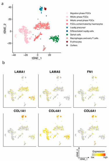 - Agelopoulou, R.; Magre, S. Expression of fibronectin and laminin in fetal male gonads in vivo and in vitro with and without testicular morphogenesis. Cell Differ. 1987, 21, 31–36. [Google Scholar] [CrossRef]