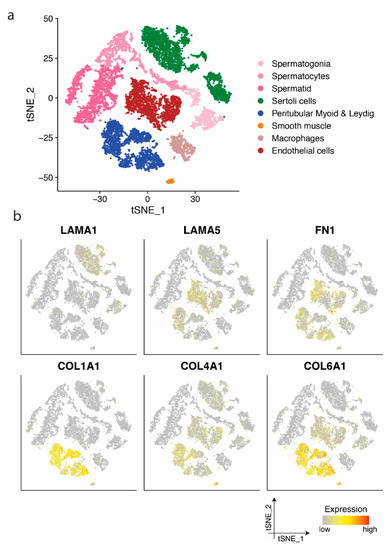 - Virtanen, I.; Lohi, J.; Tani, T.; Korhonen, M.; Burgeson, R.E.; Lehto, V.P.; Leivo, I. Distinct Changes in the Laminin Composition of Basement Membranes in Human Seminiferous Tubules during Development and Degeneration. Am. J. Pathol. 1997, 150, 1421–1431. [Google Scholar] [PubMed]
