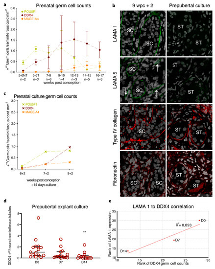 Basement membrane expression of prenatal, prepubertal, and peripubertal tissue cultures in correlation to germ cell loss. (a) Prenatal germ cell counts for POU5F1 (green), DDX4 (dark red), and MAGE-A4 (orange) are presented as the mean ±SD of positive germ cells per seminiferous cord mm2 from 5 to 17 weeks post conception. NT represents samples with not yet formed seminiferous cords; T represents samples with formed seminiferous cords. (b) Following culture for 14 days, the prenatal gonadal tissue shows seminiferous BM expression of LAMA 1 (green staining) and LAMA 5 (green staining), while type IV collagen (red staining) and fibronectin (red staining) show seminiferous BM and interstitial expression. The 14-day pre- and peripubertal testicular cultures show the loss of LAMA 1 expression and weak seminiferous BM expression of LAMA 5 with the seminiferous BM and interstitial expression of type IV collagen and fibronectin. Counterstain with DAPI (grey staining). SC depicts the seminiferous cord, white arrows indicate blood vessels, scale bar: 25 μm (c) POU5F1 (green), DDX4 (dark red), and MAGE-A4 (orange) germ cell counts for the prenatal tissue culture are presented as positive germ cells per seminiferous cord mm2 for three prenatal culture samples. (d) Number of DDX4 positive germ cells per seminiferous tubule cross-section from 16 patients. Median, fifth, and 95th percentile of DDX4 counts are shown for control (D0), D7 and D14 of culture. ** Indicate p < 0.01 significance between D0 and D14. (e) Spearman’s correlation of DDX4 positive germ cells per seminiferous tubule cross-section in relation to LAMA 1 positive seminiferous tubules for prepubertal explant cultures at D0 (n = 13), D7 (n = 12), and D14 (n = 15).
