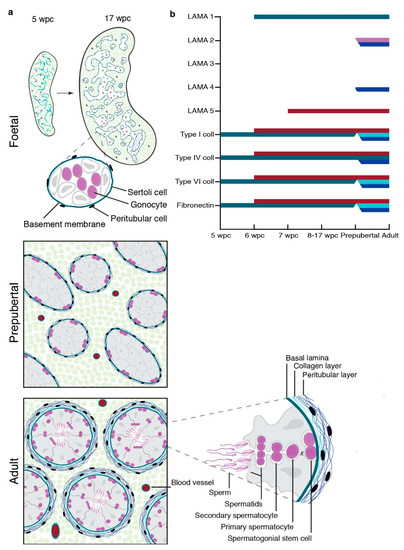 Schematic depiction of testicular LAMA, fibronectin, and collagen expression during gonadal development. (a) Establishment of a single-layered seminiferous basement membrane from 5 to 17 wpc, prepubertal, and multi-layered structure of adult seminiferous tubules. (b) Onset of LAMA 1, 2, 3, 4, and 5 as well as type I, IV, and VI collagens and fibronectin expression in prenatal first and second trimester gonads, as well as their expression pattern in prepubertal and adult testicular tissue. Colour coding: Basal lamina (green), collagenous BM layer (light blue), peritubular BM layer (dark blue), spermatocytes (pink), and vasculature (red).