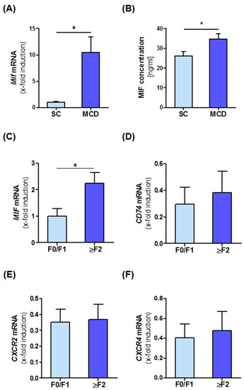 To get an insight into the potential role of MIF during NASH progression, we first analyzed intrahepatic MIF levels in a murine diet-induced model of NASH. MIF expression in whole liver tissue at both the mRNA and protein level was compared between C57BL/6J WT mice subjected to a methionine- and choline-deficient diet (MCD) for eight weeks and mice on standard chow (SC). Quantitative RT-PCR analysis revealed that Mif mRNA expression was substantially elevated (10-fold) after the MCD diet (Figure 1A). This notion was mirrored by a 1.3-fold increase in MIF protein in the livers of MCD diet-treated animals (Figure 1B). To verify if MIF induction during NASH progression is conserved across species, we analyzed intrahepatic MIF expression in a cohort of 22 patients comprising the broad spectrum of NASH from simple steatosis to advanced NASH-associated fibrosis. In NAFLD patients, MIF is up-regulated in higher fibrosis grades (2 and higher) compared to no or only mild fibrosis (grade 0 and 1) (Figure 1C). We also analyzed intrahepatic expression levels of the MIF receptors (CD74, CXCR2 and CXCR4) in NASH patients, but could not detect a significant alteration, when stratifying patients according to fibrosis grade (Figure 1D–F). When correlating intrahepatic mRNA expression of the receptors with expression of surrogate markers for fibrogenesis in this cohort, we observed a positive for CD74 (Figure S1B,C) and CXCR2 (Figure S1D,E) with markers such as ACTA2 (Figure S1B,D) and TGF-β (Figure S1C,E), while MIF expression positively correlated with intrahepatic expression of COL1a1 (Figure S1A, for further correlation also see Supplementary Table S4).