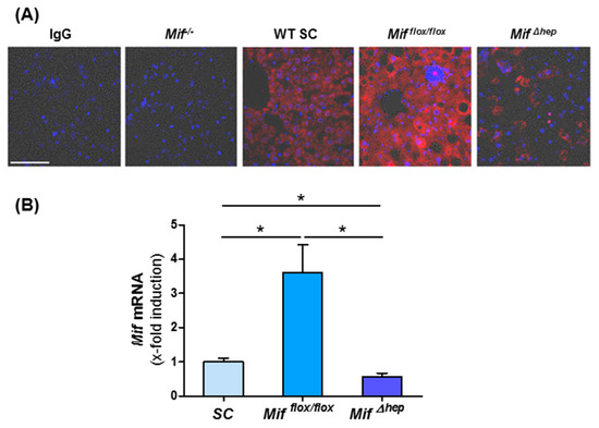 To define the main source of MIF in the liver during NASH progression, we stained liver sections from WT mice on standard chow and after eight weeks of MCD diet-induced NASH for MIF. Liver tissue of constitutively Mif-deficient mice and mice lacking Mif specifically in hepatocytes (Mif∆hep) fed 8 weeks of MCD diet served as controls. We found that strongly induced MIF protein expression in WT mice after MCD diet is mainly localized in hepatocytes (Figure 3A). To confirm the data from our immunofluorescence stainings, we performed qRT-PCR analysis. These data corroborated evidence on the induction of Mif during NASH, which was nearly completely abolished in the livers of mice specifically lacking Mif in hepatocytes (Figure 3B).