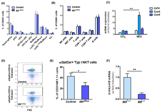 However, interestingly, when we compared the injury-dependent induction of the expression of the MIF receptors Cd74, Cxcr2, and Cxcr4 during toxin-induced liver injury and MCD-induced NASH, we identified a more than 15-fold induction of Cxcr2 selectively in the NASH model, whereas Cxcr4 and Cd74 were only slightly induced in the liver in both models (Figure 5C). Furthermore, in isolated NKT cells from Mif−/− mice, the expression level of Cxcr2 and Cxcr4 is increased after 24 h of stimulation with recombinant, murine MIF (Figure S4A,B). Of note, CXCR2 has been shown to mediate NKT cell accumulation by MIF to the tissue in a model of skin inflammation [38]. With regard to these findings and the established functional role of NKT subsets in liver fibrosis, we proceeded to further characterize the NKT subset repertoire in our NASH model. Using multicolor flow cytometry analysis, we detected a significantly decreased accumulation of the type I NKT cell subset in the Mif∆hep mice compared to control mice (Figure 5D,E). This observation could also be extended to global Mif−/− mice by assessing mRNA expression levels of type I NKT specific marker Vα14Jα18 in Mif−/− mice and corresponding controls after MCD diet feeding (Figure 5F). In line with these data, the functionality of type I NKT cells might be impaired in MifΔhep mice, which is implicated by diminished mRNA expression levels of T-bet, Cxcr3 and Il-17 (Figure S5A–C).