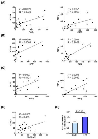 Expression of NKT cell marker correlates with fibrosis markers of patients with non-alcoholic steatohepatitis. Correlation analyses of mRNA expression level in NASH patient samples were performed by qRT-PCR analysis. There were 22 human samples from liver resections with different stages of steatosis and fibrosis analyzed. (A) NKT-associated FASL expression was correlated with ACTA2 (left panel) and TGF-β (right panel) expression. (B) Fibrosis-related expression of ACTA2 (left panel) and TGF-β (right panel) were correlated with OPN expression. (C) Correlation analysis between ACTA2 (left panel) and TGF-β (right panel) with inflammatory marker IFN-γ (D) Expression of ACTA2 were correlated with the type I NKT related gene Vα24Jα18 via qRT-PCR. (E) Expression pattern of Vα24Jα18 was measured by qRT-PCR in different fibrosis grades in patients.
