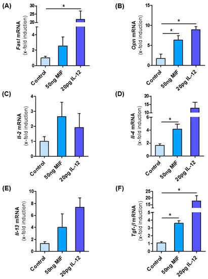As Mif∆hep mice show decreased type I NKT cells, we finally asked whether MIF might directly influence NKT cell polarization and thereby modulate the intrahepatic microenvironment during NASH. To address this hypothesis, we isolated NKT cells from Mif−/− mice to exclude bias from intrinsic MIF expression by the cells and incubated them with recombinant murine MIF for 24 h. As a positive control, we stimulated the NKT cells with recombinant murine IL-12, a known activator of type I differentiation. After MIF stimulation of NKT cells, we observed an increase in mRNA expression of Fasl and Opn (Figure 7A,B); two factors linked to the pro-fibrotic function of type I NKT cells. Furthermore, specific interleukins, e.g., Il-2, Il-4 and Il-13, which are associated with type I NKT subset were up-regulated in the same manner as after the stimulation with IL-12 (Figure 7C–E) as well as the pro-fibrotic cytokine and HSC stimulator Tgf-β (Figure 7F). Of note, TGF-β secretion is also a hallmark of type I NKT differentiation [39].
