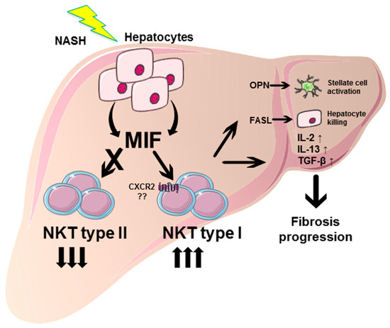 Taken together, these data suggest that the pro-fibrotic effect of the cytokine MIF in NASH-induced fibrosis progression may—at least in part—be due to a direct effect on NKT cell polarization and perpetuation of the fibrogenic response (Figure 8).