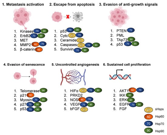 The proteomic landscape of the hallmarks of cancer: The processes of metastasis, uncontrolled angiogenesis, evasion of anti-growth signals, escape from apoptosis, cell proliferation and evasion of senescence are all crucial to tumor cell growth. Each of these processes is regulated by several proteins that play important roles in the respective signaling pathways. As chaperones, sHsps, Hsp70, Hsp90 and Hsp60 associate with several proteins that regulate cancer signaling pathways.