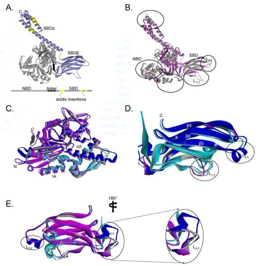 Hsp70s are typically characterized by an N-terminal nucleotide binding domain (NBD) and a C-terminal substrate binding domain (SBD), connected by a linker (Figure 2). Although the NBDs of canonical and non-canonical Hsp70s exhibit relatively high sequence conservation, their SBDs are more divergent []. In spite of their high conservation, members of the Hsp70 family are characterized by unique signature motifs that define their functional specialization within cells. Notably, Hsp110s are marked by extended acidic insertions located within their substrate binding domain, SDB-β and SBD-α subunits ([], Figure 2A). Additionally, Hsp110s possess linker segments that are distinct from canonical Hsp70s [,]. Hsp110/Grp170 families also harbor unique TEDWYLEE motifs which distinguish them from canonical Hsp70s []. Although at present the actual functions of these motifs have not yet been determined, they are thought to facilitate co-chaperone or client protein binding in light of their location in the SBD. Interestingly, human Hsp110/Grp170 group members are delineated from each other by unique TEDWYLEE motifs [].