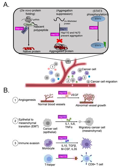 Roles of Hsp110 in cancer cells: (A) Hsp110 co-operates with Hsp70 complexed to its co-chaperone Hsp40 to facilitate folding of nascent polypeptides in tumor cells. Hsp110 also independently suppresses aggregation of oncogenic proteins and regulates functional competence of molecules such as STAT3 whose phosphorylation it facilitates, thereby promoting tumor cell proliferation. (B) Hsp110 modulates metastasis in tumour cells via interaction with VEGF leading to abnormal angiogenesis (1). Hsp110 is also involved in EMT via association with proinflammatory cytokines (2) and in immune evasion pathways (3) which ultimately result in metastasis.