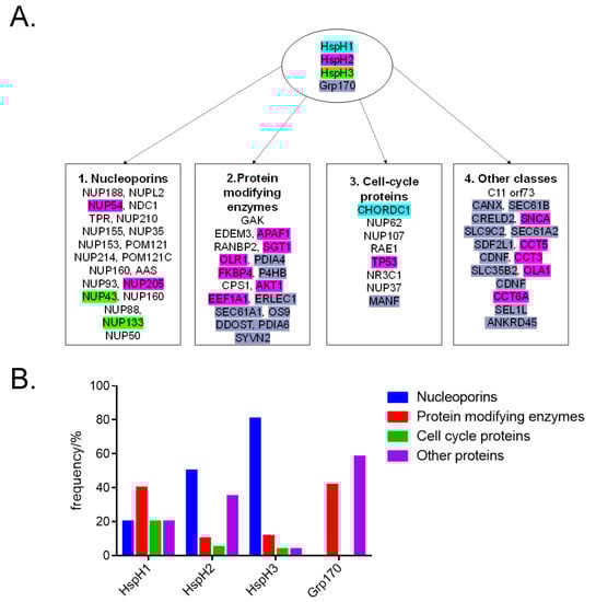 Predicted clients of Hsp110 and Grp170 members: (A) The predicted clientele of HSP110 and Grp170 are shown. Client proteins that are unique to each Hsp110/Grp170 type are shown highlighted in blue (HspH1), purple (HspH2), green (HspH3) and green (Grp170). Client proteins that are shared by more than one Hsp110/Grp170 type are not highlighted. Predictions were conducted using STRING database at a cut off score of 0.75. (B) Bar graph showing relative frequencies of clients of Hsp110 and Grp170 chaperones. While HspH1, HspH2 and HspH3 are generally predicted to associate with nucleoporins and cell-cycle regulating proteins, Grp170 interacts with a large complement of protein modifying enzymes and proteins involved in other functions such as translocation.
