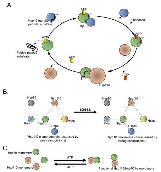 Hsp110 is known to directly associate with canonical Hsp70 through NBD–NBD interactions ([,,], Figure 5) to form a heterodimer that facilitates Hsp70-based protein folding. Hsp110 acts a co-chaperone of Hsp70, facilitating the exchange of ADP for ATP state, leading to substrate release from the canonical Hsp70 partner (Figure 5). Given that Hsp70 facilitates the folding of virtually all proteins within the cell [], the NEF role of Hsp110 in this regard is crucial to the efficient function of canonical Hsp70.