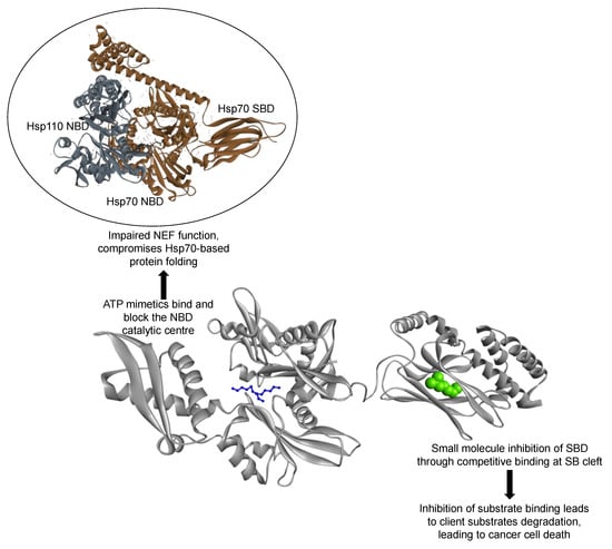 Owing to their prominent role as chaperones, Hsp110 and Grp170 could serve as novel chemotherapeutic targets against cancer. Small molecule inhibitors such as polymyxin B (PMB) and epigallocatechin gallate (EGCG) possess great potential in this regard, as they have been successfully used to inhibit the activity of the Plasmodium falciparum Hsp110 in vitro []. These two compounds bind to the NBD, thus abrogating the basal ATPase activity of the Hsp110. However, since the holdase chaperone function of Hsp110/Grp170 is not modulated by nucleotides, targeting the Hsp110 NBD using nucleotide mimetics might not interfere with their direct chaperone role. However, the same NBD-targeted drugs may disrupt the NEF function of these chaperones which in turn would adversely impact fold and function of several proteins implicated in cancer development. Selectively targeting the SBD of Hsp110/Grp170 using peptide substrate mimetics may be an alternative approach. Two drug candidates targeting the SBD of Hsp70, 2-phenylethynesulfonamide (PES) and the TKD-motif directed peptide inhibitor, cmHsp70.1 have entered the clinical trials stage [,,]. The design of domain-specific inhibitory compounds may prove useful in Hsp110-targeted anticancer therapy (Figure 6). Since Hsp110/Grp170 functions in co-operation with several other Hsps, its inhibition may impact the folding fate of the protein complement that drives cancer development and progression. In a recent study, Gozzi [] designed a novel NBD-binding small molecule inhibitor which compromises Hsp110 chaperone function, thereby inhibiting STAT3 phosphorylation and colorectal cancer cell proliferation. There is therefore an urgent need for identification of novel compounds that target Hsp110/Grp170 chaperones in the fight against cancer. Apart from chemical compounds, antibodies and aptamers could alternatively be designed towards abrogating Hsp110/Grp170 functions. In a colon cancer murine model, an Hsp70 monoclonal antibody-based inhibitor, cmHsp70.1, which binds the TKD motif, was shown to significantly reduce tumor weight and improve survival rate []. One of the main challenges in the design of anticancer agents is to develop compounds that are safe. The varied proteomic composition of cancer cells compared to normal cells makes the inhibition of Hsps promising in light of their role as custodians of proteostasis.