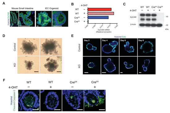 Generation and characterization of Epithelial Cell Adhesion Molecule (EpCAM)-deficient organoids. (A) Immunofluorescence microscopy confirming EpCAM expression in mouse small intestine in vivo and intestinal organoids in vitro. EpCAM (green). Bars = 50 μM. (B) qPCR demonstrating that EpCAM mRNA is efficiently deleted in KO organoids (normalized to β-actin). (C) Silencing of EpCAM protein expression in KO organoids demonstrated by Western blotting. (D) Phase contrast photomicrographs of control (untreated ROSA26-CreERT2+ EpCAMfl/fl) and KO (4-OHT-treated ROSA26-CreERT2+ EpCAMfl/fl) organoids. Bars = 100 μM. (E) Assessment of cell proliferation in control and KO organoids after EdU incorporation and fluorescence microscopic detection using Click-iT methodology. Alexa Fluor 488-conjugated EdU (green). Bars = 50 μM. (F) Apoptosis in control and KO organoids. Cleaved Caspase-3 (green) detected via immunofluorescence microscopy. Bars = 25 μM. Nuclear counterstaining, Hoechst 33342 (blue) in (A,E,F).