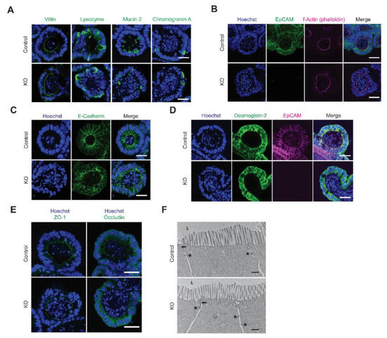 3.3. IEC Differentiation Occured in EpCAM KO Organoids and Cell Polarity Was Preserved