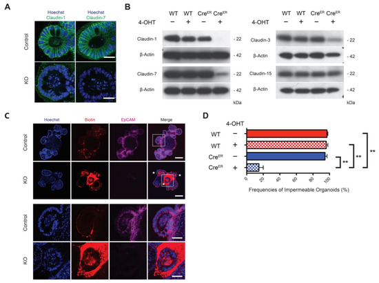3.5. Selected Claudins Were Destabilized in KO Organoids and Epithelial Integrity Was Compromised