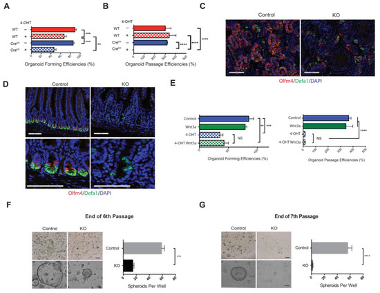 Effects of EpCAM loss on IEC stem cells and/or stem cell function. (A) KO organoids form less efficiently than control organoids. Efficiencies represent ratios of organoid numbers/well at Day 9 over crypt numbers/well on Day 1. Aggregate data from 3 independent experiments are depicted. ** p < 0.01 and *** p < 0.001 via Student’s t test. (B) KO organoids cannot be subcultured. Organoid passage efficiencies represent ratios of organoid numbers/well at Day 9 of secondary cultures over organoid numbers/well at Day 9 of primary cultures. Representative results from 1 of 2 independent experiments are shown. **** p < 0.0001 via Student’s t test. (C) Abnormalities in stem cells and Paneth cells in KO organoids at Day 9 revealed via FISH (Olfm4 (red); Defa1 (green); DAPI (blue)). Bars = 100 μM. Data from 1 of 3 independent experiment are shown. (D) Small intestinal epithelial stem cells and Paneth cells in EpCAM-deficient mice on Day 7 after initiation of tamoxifen treatment identified by FISH (Olfm4 (red); Defa1 (green); DAPI (blue)). Bars = 100 μM. Data from 1 of 3 independent experiments are shown. (E) Forming and passaging efficiencies of KO organoids with, and without, treatment with exogenous Wnt-3a (100 ng/mL). ** p < 0.01, *** p < 0.001 and **** p < 0.0001 via Student’s t test. NS; not significant. Data from 1 of 3 independent experiments are shown. (F and G) Phase contrast photomicrographs and numbers of control and EpCAM KO spheroids on Day 3 of the 6th passage (F) or on Day 3 of the 7th passage (G). Bars = 500 μ (upper), 100 μM (lower). *** p < 0.001 and **** p < 0.0001 via Student’s t test. Representative images from 1 of 3 independent experiments and aggregate data from three independent experiments are shown in (F,G). 4-OHT was added at the beginning of passage 6. Data depicted represent mean ± SEM in (A,B,E–G).