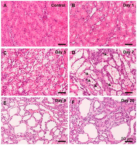 Control kidneys showed normal renal histological architecture (Figure 1A). On days 1 and 3 after CDDP injection, renal proximal tubular epithelial cells, especially at the S3 segment in the corticomedullary junction, underwent swelling with nuclear degeneration (Figure 1B); the degeneration was more clearly seen on day 3. On days 5 and 7, renal epithelial cells of the affected tubules were desquamated (Figure 1C,D), and then, the tubules were variously dilated, being lined by regenerating flattened or cuboidal epithelial cells. In addition, inflammatory cells began to be seen around the affected renal tubules and their lumina. On days 9 (Figure 1E), 12, and 15, the regenerating epithelial cells showed variable morphology (flattened, polyhedral, and cuboidal), indicating abnormal regeneration; around the variously dilated renal tubules, interstitial fibrosis was developed, accompanied by inflammatory cells. On day 20, interstitial fibrosis was more progressive, particularly around the renal tubules with incompletely regenerating epithelial cells (Figure 1F); inflammatory cells were continuously observed.