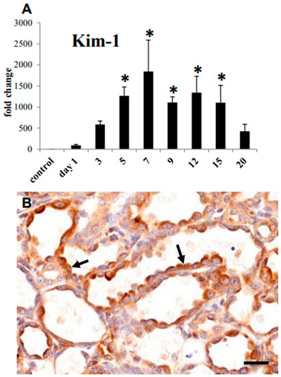 mRNA expression of kidney injury molecule-1 (KIM-1), a well-known biomarker for renal proximal tubule injury [21,22], was increased significantly on days 5–15 (Figure 2A), being consistent with histological tubular damage. The immunoreaction to KIM-1 was seen mainly in cuboidal or flattened epithelial cells in the damaged renal tubules (Figure 2B). The KIM-1 expression reflected the histopathological findings of renal tubular damages/abnormal regeneration.