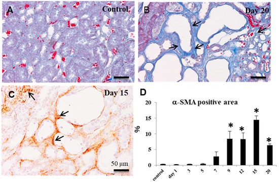 In the kidneys of control and on days 1 and 3, interstitial fibrosis was not seen (fibrosis degree, −) in the affected corticomedullary junction. Collagen fibers stained blue with the azan–Mallory method began to be gradually seen around the affected renal tubules on days 5 (−~1+), 7 (1+~2+), 9 (2+~3+), and 12 (2+~3+); the deposition degree became gradually severe on days 15 (3+~4+) and 20 (3+~4+) (Figure 3A,B). Immunohistochemically, on day 7, α-SMA+ myofibroblasts began to clearly appear in the interstitium around the affected renal tubules lined by abnormal regenerating epithelial cells. On day 9 onwards, the area of α-SMA+ myofibroblasts showed a significant increase with a peak on day 15 (Figure 3C,D), in comparison to controls. The area of α-SMA-positive myofibroblasts sufficiently reflected the degrees of progressive interstitial fibrosis.