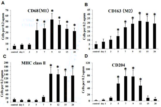 The number of macrophages reacting to CD68 (A, for M1), CD163 (B, for M2), MHC class II (C), and CD204 (D) in the control and CDDP-treated kidney on days 1–20. Note that the kinetics of these macrophages in comparison to controls differ from each other. Dunnett’s test, *, significantly different from controls at p < 0.05.